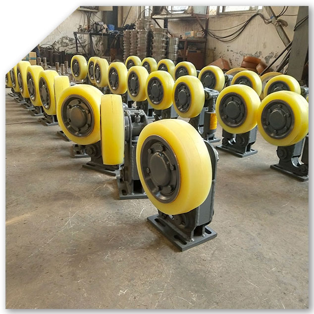 罐道轮为一种立井提升容器用滚轮罐耳,其结构由底座、摆转臂、滚轮、缓冲器组成;滚轮罐耳结合我国矿山特点为目前运行中的提升容器更换新型滚轮导向装置提供了便利条件,广泛应用与矿山,煤炭等工业生产部门。罐道与罐耳由滑动摩擦变为滚动摩擦,因此减少了动力消耗,降低了噪音,罐道和罐耳的磨损也大大降低。从而,提高了罐道和罐耳的使用寿命。